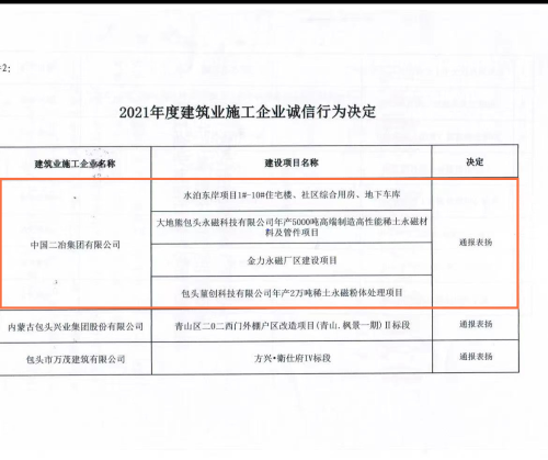 根據(jù)考核結(jié)果,中國二冶水泊東岸項(xiàng)目、大地熊項(xiàng)目、金力永磁項(xiàng)目、堇創(chuàng)項(xiàng)目的誠信行為受到通報表揚(yáng)。該考核決定將通過“包頭市建筑市場監(jiān)管與誠信信息平臺”向社會公布。