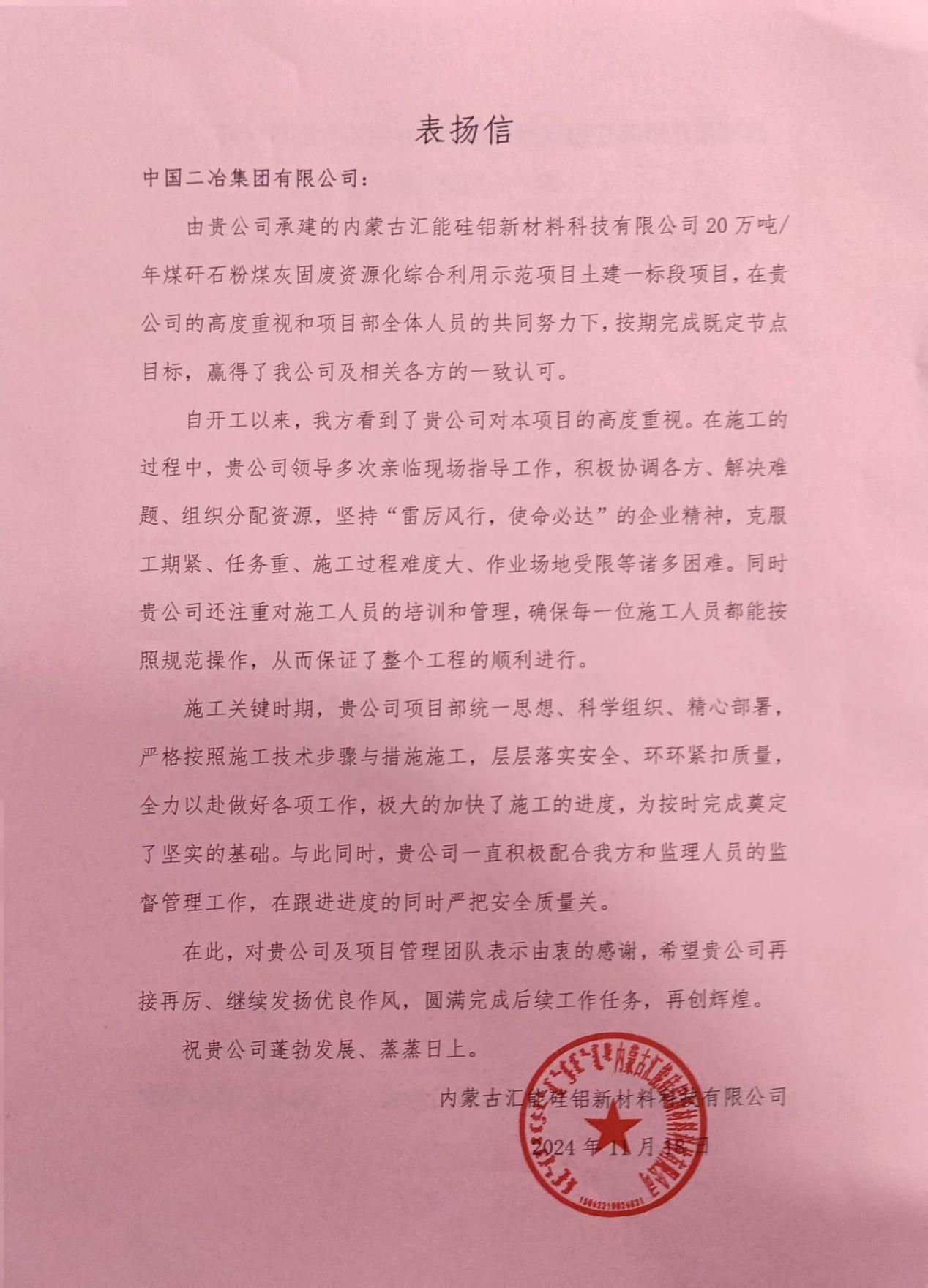 11月25日,中國二冶收到內(nèi)蒙古匯能硅鋁新材料科技有限公司表揚信,高度認(rèn)可和贊揚內(nèi)蒙古匯能硅鋁新材料科技有限公司20萬噸/年煤矸石粉煤灰固廢資源化綜合利用示范項目土建一標(biāo)段項目按期完成既定節(jié)點目標(biāo)。